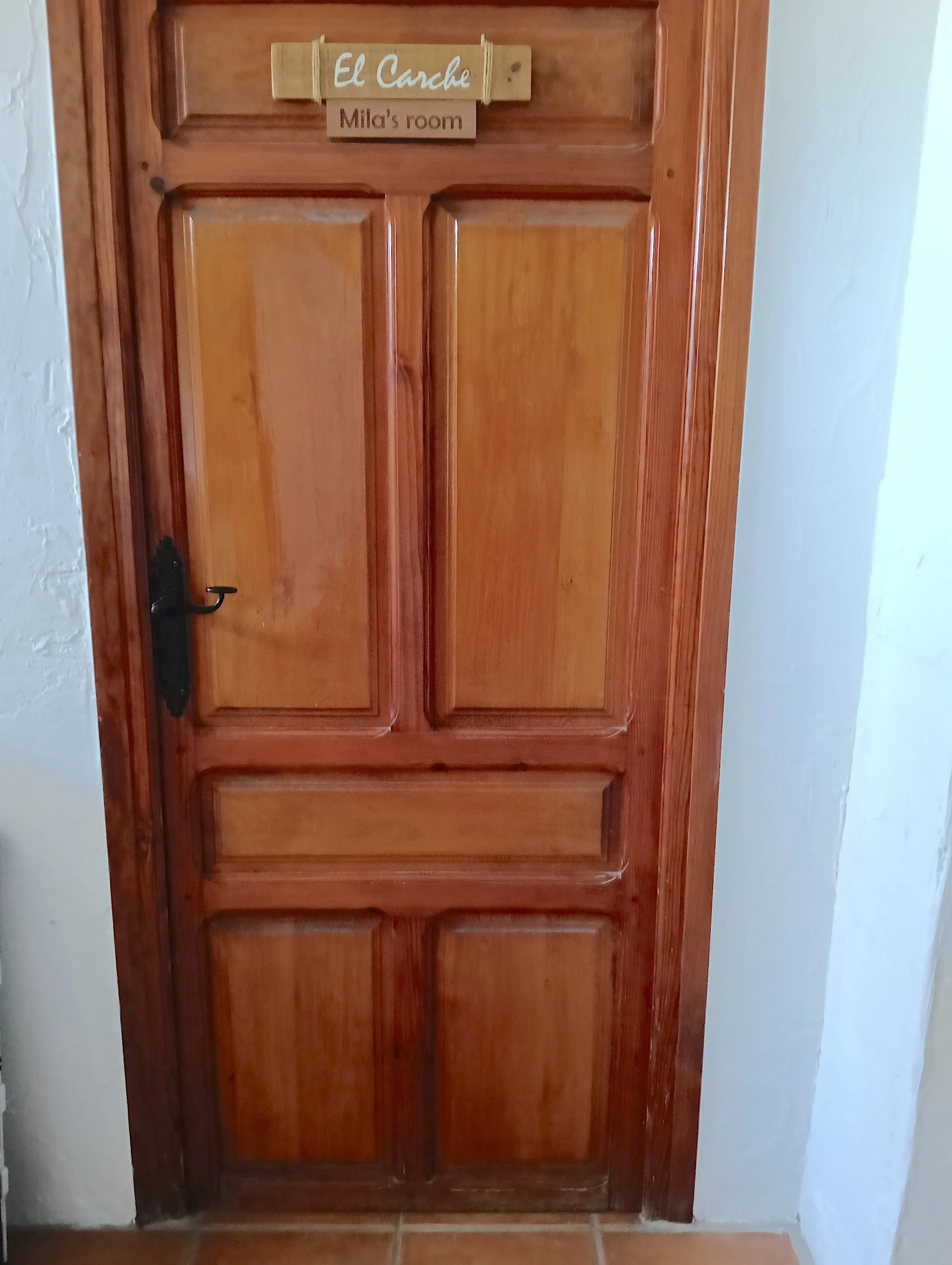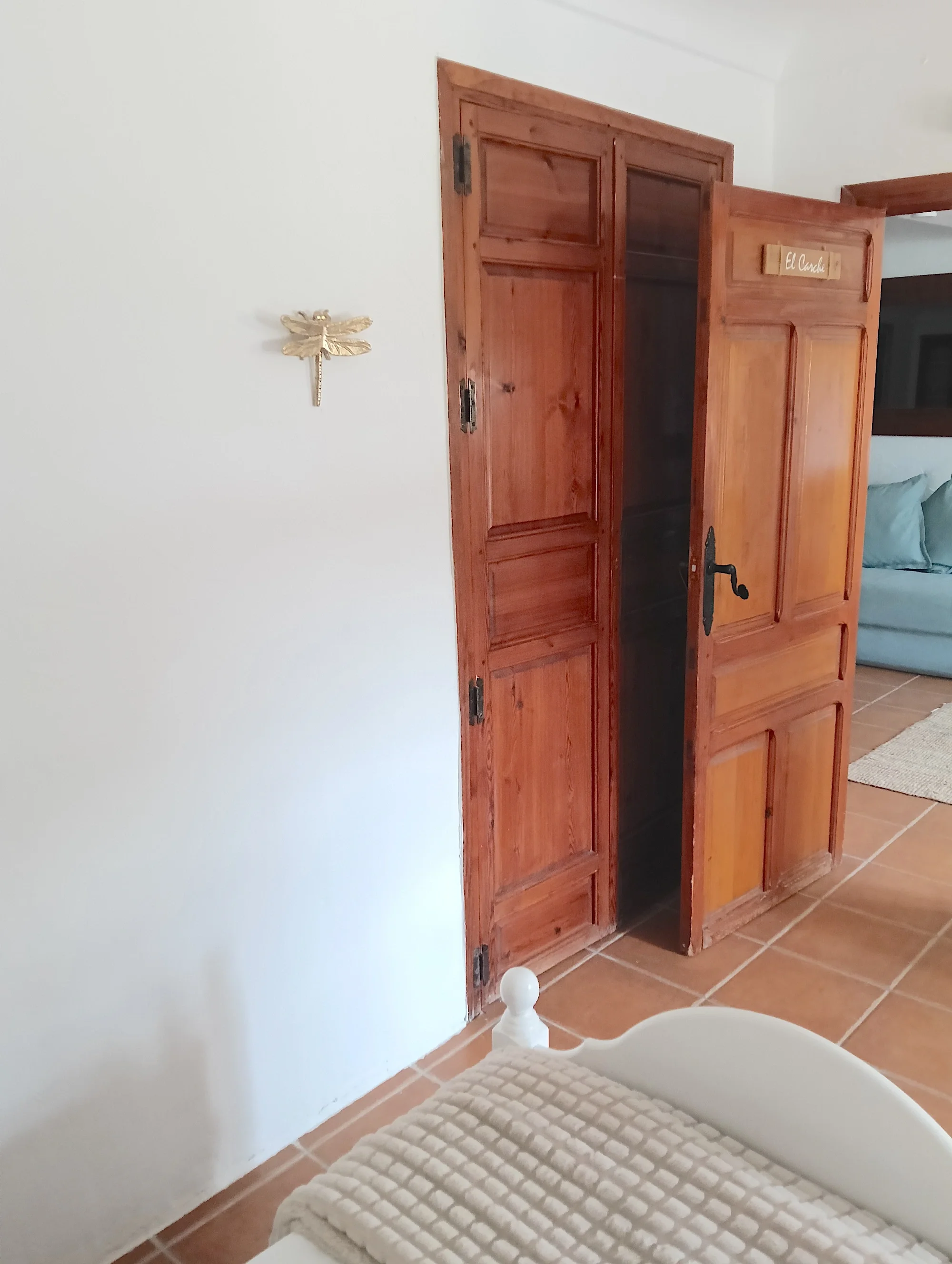 Bathed in natural light, this charming double room perfectly captures the essence of La Buena Vida's historic character. The room features traditional terracotta floor tiles and pristine white walls, creating a bright, airy Mediterranean atmosphere. A beautiful antique wooden wardrobe with carved detailing is built into the room, while an ornate gilded circular mirror and decorative console table with distinctive spiral-turned legs add authentic Spanish character. The room benefits from large wooden-framed windows, allowing plenty of natural light and views toward the front of the property.